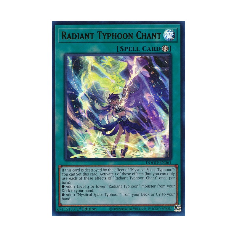 Texto (EN): If this card is destroyed by the effect of "Mystical Space Typhoon": You can Set this card. Activate 1 of these effects (but you can only use each of these effects of "Radiant Typhoon Chant" once per turn); ● Add 1 Level 4 or lower "Radiant Typhoon" monster from your Deck to your hand. ● Add 1 "Mystical Space Typhoon" from your Deck or GY to your hand.