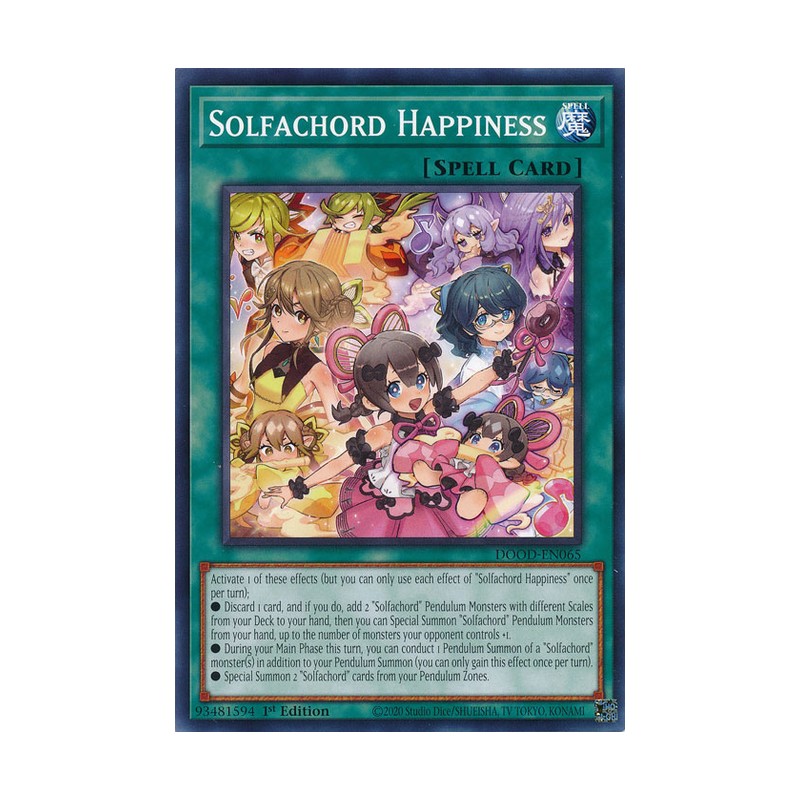 Texto (EN): Activate 1 of these effects (but you can only use each effect of "Solfachord Happiness" once per turn); ● Discard 1 card, and if you do, add 2 "Solfachord" Pendulum Monsters with different Scales from your Deck to your hand, then you can Special Summon "Solfachord" Pendulum Monsters from your hand, up to the number of monsters your opponent controls +1. ● During your Main Phase this turn, you can conduct 1 Pendulum Summon of a "Solfachord" monster(s) in addition to your Pendulum Summon (you can only gain this effect once per turn). ● Special Summon 2 "Solfachord" cards from your Pendulum Zones.