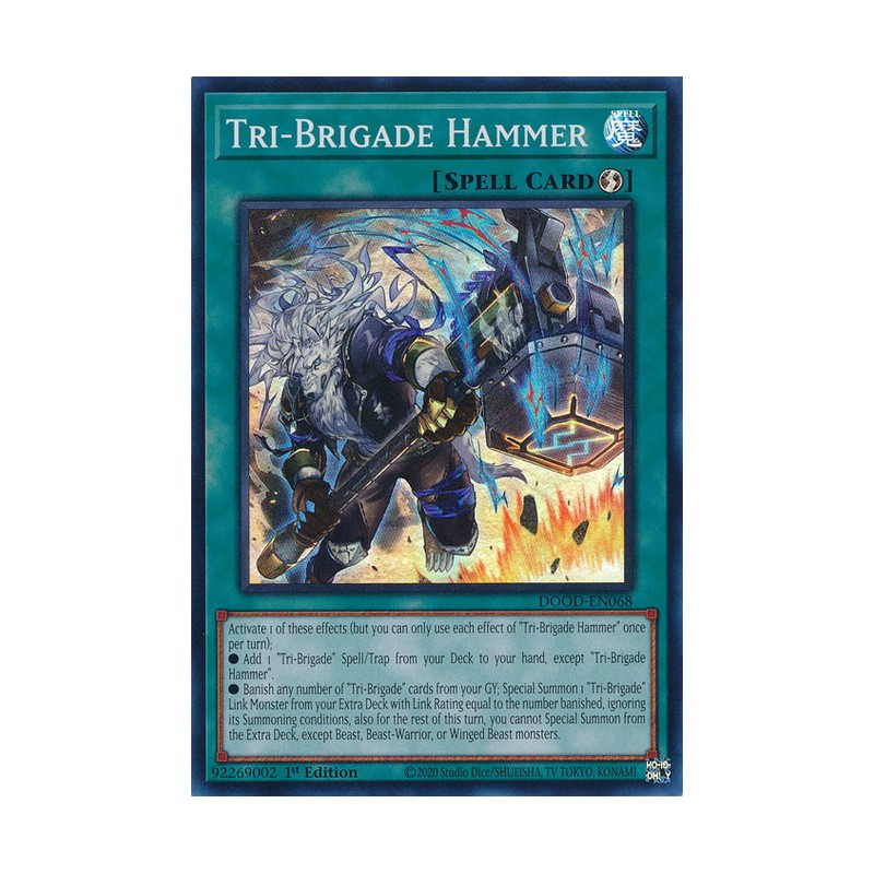 Texto (EN): Activate 1 of these effects (but you can only use each effect of "Tri-Brigade Hammer" once per turn); ● Add 1 "Tri-Brigade" Spell/Trap from your Deck to your hand, except "Tri-Brigade Hammer". ● Banish any number of "Tri-Brigade" cards from your GY; Special Summon 1 "Tri-Brigade" Link Monster from your Extra Deck with Link Rating equal to the number banished, ignoring its Summoning conditions, also for the rest of this turn, you cannot Special Summon from the Extra Deck, except Beast, Beast-Warrior, or Winged Beast monsters.