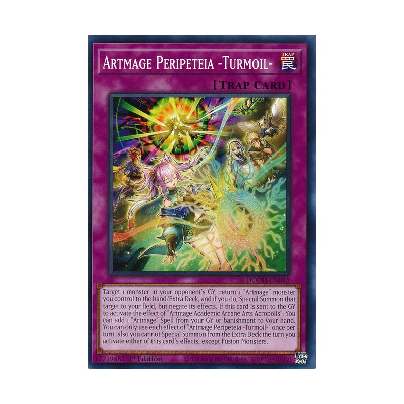Texto (EN): Target 1 monster in your opponent's GY; return 1 "Artmage" monster you control to the hand/Extra Deck, and if you do, Special Summon that target to your field, but negate its effects. If this card is sent to the GY to activate the effect of "Artmage Academic Arcane Arts Acropolis": You can add 1 "Artmage" Spell from your GY or banishment to your hand. You can only use each effect of "Artmage Peripeteia -Turmoil-" once per turn, also you cannot Special Summon from the Extra Deck the turn you activate either of this card's effects, except Fusion Monsters.
