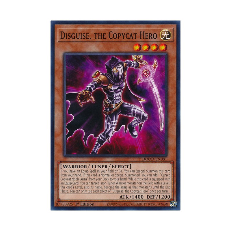 Texto (EN): If you have an Equip Spell in your field or GY: You can Special Summon this card from your hand. If this card is Normal or Special Summoned: You can add 1 "Cursed Copycat Noble Arms" from your Deck to your hand. While this card is equipped with an Equip Card: You can target 1 non-Tuner Warrior monster on the field with a Level; this card's Level, also its name, become the same as that monster's until the End Phase. You can only use each effect of "Disguise, the Copycat Hero" once per turn.