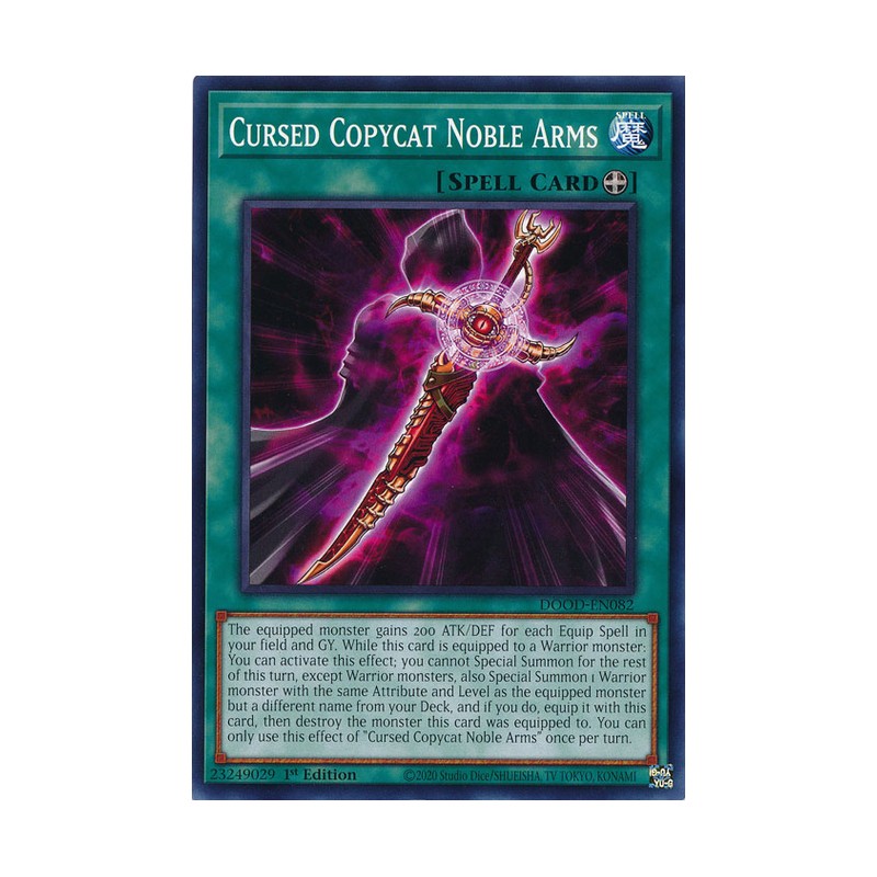 Texto (EN): The equipped monster gains 200 ATK/DEF for each Equip Spell in your field and GY. While this card is equipped to a Warrior monster: You can activate this effect; you cannot Special Summon for the rest of this turn, except Warrior monsters, also Special Summon 1 Warrior monster with the same Attribute and Level as the equipped monster but a different name from your Deck, and if you do, equip it with this card, then destroy the monster this card was equipped to. You can only use this effect of "Cursed Copycat Noble Arms" once per turn.