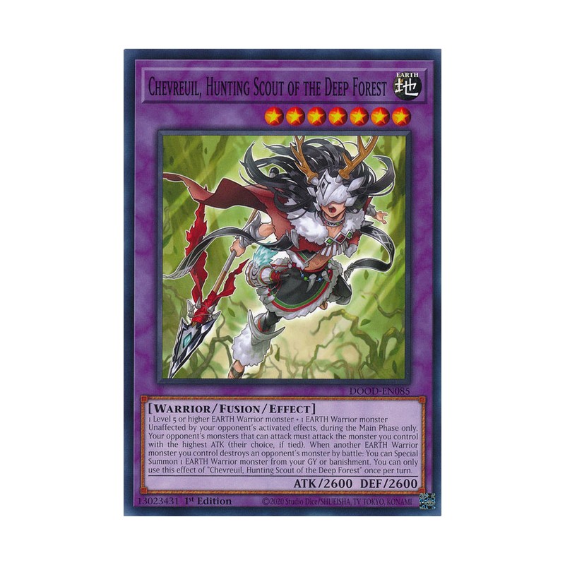 Texto (EN): 1 Level 5 or higher EARTH Warrior monster + 1 EARTH Warrior monster Unaffected by your opponent's activated effects, during the Main Phase only. Your opponent's monsters that can attack must attack the monster you control with the highest ATK (their choice, if tied). When another EARTH Warrior monster you control destroys an opponent's monster by battle: You can Special Summon 1 EARTH Warrior monster from your GY or banishment. You can only use this effect of "Chevreuil, Hunting Scout of the Deep Forest" once per turn.