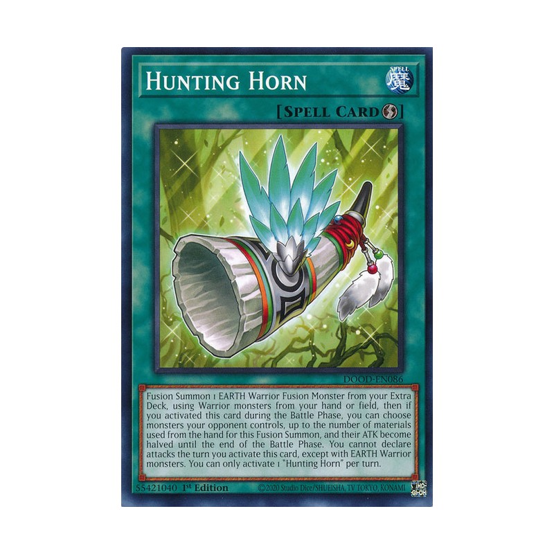 Texto (EN): Fusion Summon 1 EARTH Warrior Fusion Monster from your Extra Deck, using Warrior monsters from your hand or field, then if you activated this card during the Battle Phase, you can choose monsters your opponent controls, up to the number of materials used from the hand for this Fusion Summon, and their ATK become halved until the end of the Battle Phase. You cannot declare attacks the turn you activate this card, except with EARTH Warrior monsters. You can only activate 1 "Hunting Horn" per turn.