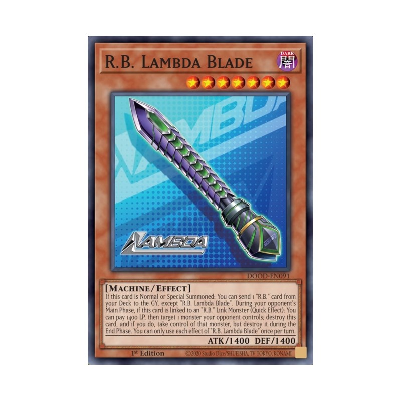 Texto (EN): If this card is Normal or Special Summoned: You can send 1 "R.B." card from your Deck to the GY, except "R.B. Lambda Blade". During your opponent's Main Phase, if this card is linked to an "R.B." Link Monster (Quick Effect): You can pay 1400 LP, then target 1 monster your opponent controls; destroy this card, and if you do, take control of that monster, but destroy it during the End Phase. You can only use each effect of "R.B. Lambda Blade" once per turn.