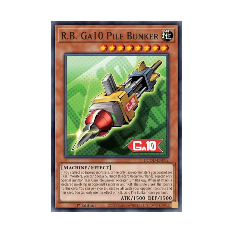 Texto (EN): If you control no face-up monsters, or the only face-up monsters you control are "R.B." monsters, you can Special Summon this card (from your hand). You can only Special Summon "R.B. Ga10 Pile Bunker" once per turn this way. When an attack is declared involving an opponent's monster and "R.B. The Brute Blues" that points to this card: You can pay 1500 LP; destroy all cards your opponent controls and this card. You can only use this effect of "R.B. Ga10 Pile Bunker" once per turn.