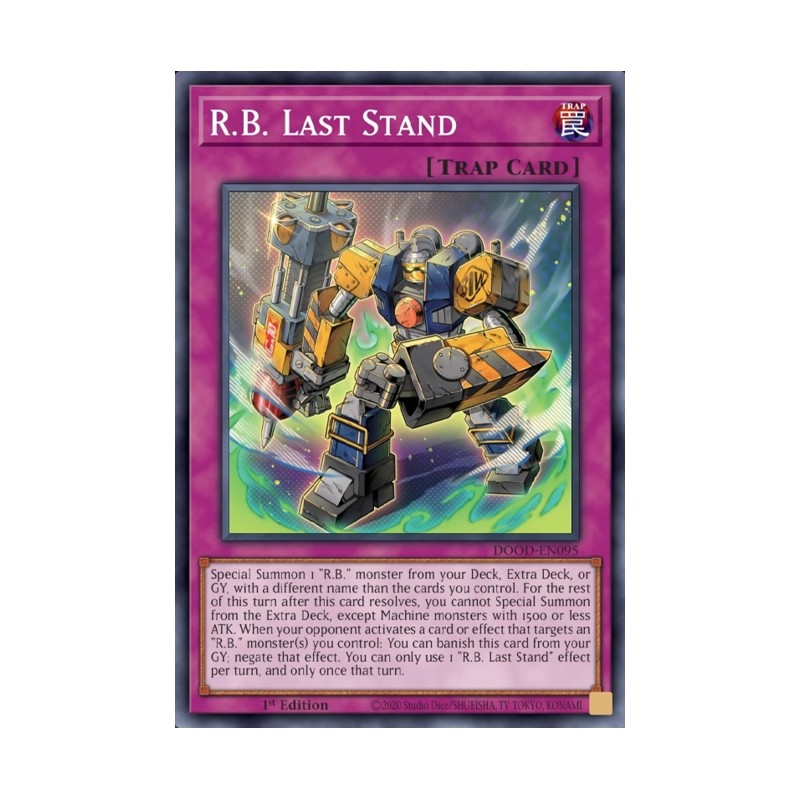Texto (EN): Special Summon 1 "R.B." monster from your Deck, Extra Deck, or GY, with a different name than the cards you control. For the rest of this turn after this card resolves, you cannot Special Summon from the Extra Deck, except Machine monsters with 1500 or less ATK. When your opponent activates a card or effect that targets an "R.B." monster(s) you control: You can banish this card from your GY; negate that effect. You can only use 1 "R.B. Last Stand" effect per turn, and only once that turn.