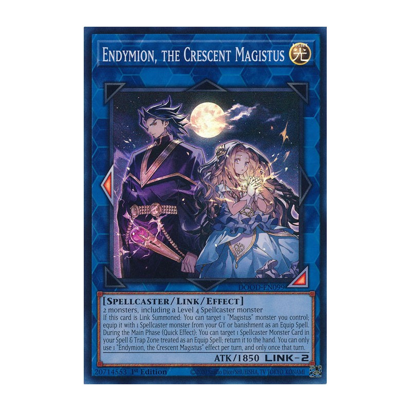 Texto (EN): 2 monsters, including a Level 4 Spellcaster monster If this card is Link Summoned: You can target 1 "Magistus" monster you control; equip it with 1 Spellcaster monster from your GY or banishment as an Equip Spell. During the Main Phase (Quick Effect): You can target 1 Spellcaster Monster Card in your Spell & Trap Zone treated as an Equip Spell; return it to the hand. You can only use 1 "Endymion, the Crescent Magistus" effect per turn, and only once that turn.