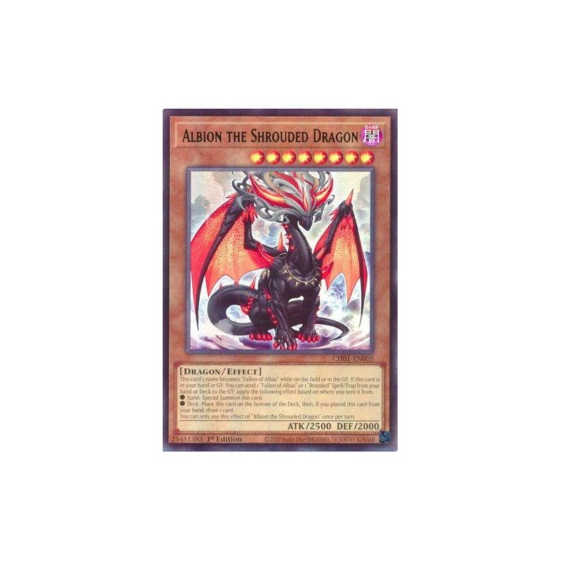 Texto (EN): This card's name becomes "Fallen of Albaz" while on the field or in the GY. If this card is in your hand or GY: You can send 1 "Fallen of Albaz" or 1 "Branded" Spell/Trap from your hand or Deck to the GY; apply the following effect based on where you sent it from. ● Hand: Special Summon this card. ● Deck: Place this card on the bottom of the Deck, then, if you placed this card from your hand, draw 1 card. You can only use this effect of "Albion the Shrouded Dragon" once per turn.