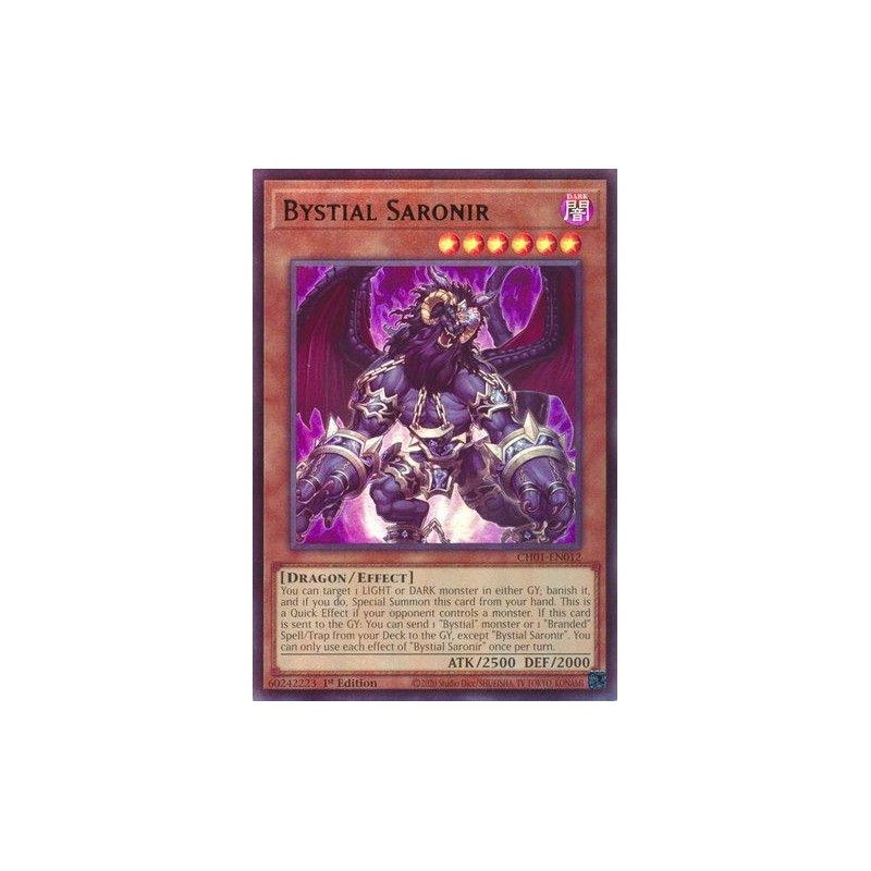 Texto (EN): You can target 1 LIGHT or DARK monster in either GY; banish it, and if you do, Special Summon this card from your hand. This is a Quick Effect if your opponent controls a monster. If this card is sent to the GY: You can send 1 "Bystial" monster or 1 "Branded" Spell/Trap from your Deck to the GY, except "Bystial Saronir". You can only use each effect of "Bystial Saronir" once per turn.