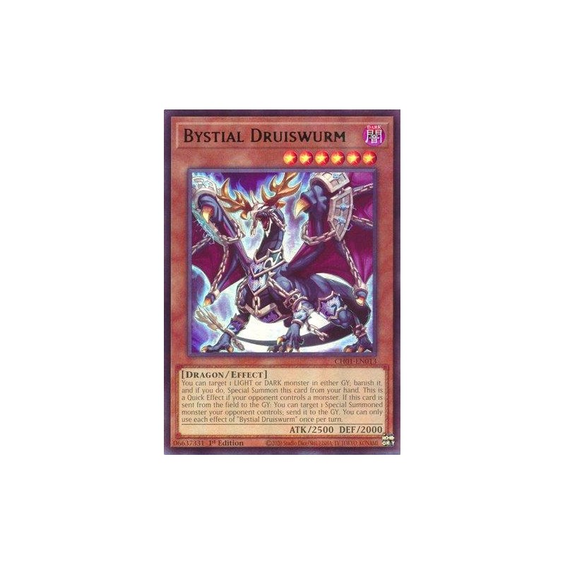 Texto (EN): You can target 1 LIGHT or DARK monster in either GY; banish it, and if you do, Special Summon this card from your hand. This is a Quick Effect if your opponent controls a monster. If this card is sent from the field to the GY: You can target 1 Special Summoned monster your opponent controls; send it to the GY. You can only use each effect of "Bystial Druiswurm" once per turn.