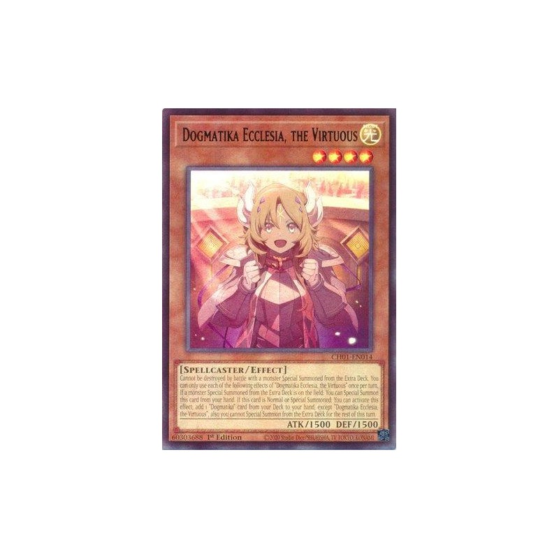 Texto (EN): Cannot be destroyed by battle with a monster Special Summoned from the Extra Deck. You can only use each of the following effects of "Dogmatika Ecclesia, the Virtuous" once per turn. If a monster Special Summoned from the Extra Deck is on the field: You can Special Summon this card from your hand. If this card is Normal or Special Summoned: You can activate this effect; add 1 "Dogmatika" card from your Deck to your hand, except "Dogmatika Ecclesia, the Virtuous", also you cannot Special Summon monsters from the Extra Deck for the rest of this turn.