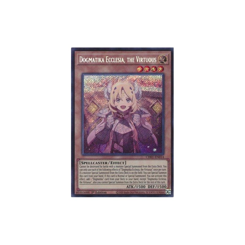 Texto (EN): Cannot be destroyed by battle with a monster Special Summoned from the Extra Deck. You can only use each of the following effects of "Dogmatika Ecclesia, the Virtuous" once per turn. If a monster Special Summoned from the Extra Deck is on the field: You can Special Summon this card from your hand. If this card is Normal or Special Summoned: You can activate this effect; add 1 "Dogmatika" card from your Deck to your hand, except "Dogmatika Ecclesia, the Virtuous", also you cannot Special Summon monsters from the Extra Deck for the rest of this turn.