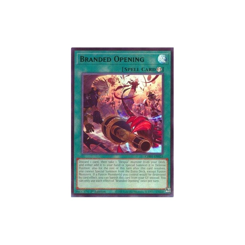Texto (EN): Discard 1 card, then take 1 "Despia" monster from your Deck, and either add it to your hand or Special Summon it in Defense Position, also for the rest of this turn after this card resolves, you cannot Special Summon monsters from the Extra Deck, except Fusion Monsters. If a Fusion Monster(s) you control would be destroyed by card effect, you can banish this card from your GY instead. You can only use each effect of "Branded Opening" once per turn.