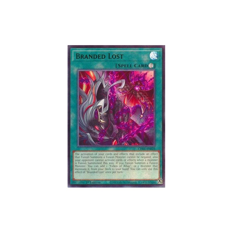Texto (EN): The activation of your cards and effects that include an effect that Fusion Summons a Fusion Monster cannot be negated, also your opponent cannot activate cards or effects when a monster is Fusion Summoned this way. If you Fusion Summon a Fusion Monster: You can add 1 "Fallen of Albaz", or 1 monster that mentions it, from your Deck to your hand. You can only use this effect of "Branded Lost" once per turn.
