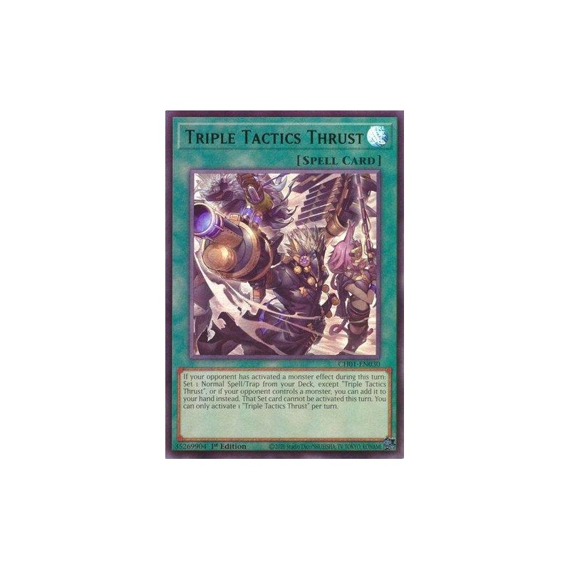Texto (EN): If your opponent has activated a monster effect during this turn: Set 1 Normal Spell/Trap directly from your Deck, except "Triple Tactics Thrust", or if your opponent controls a monster, you can add it to your hand instead. That Set card cannot be activated this turn. You can only activate 1 "Triple Tactics Thrust" per turn.
