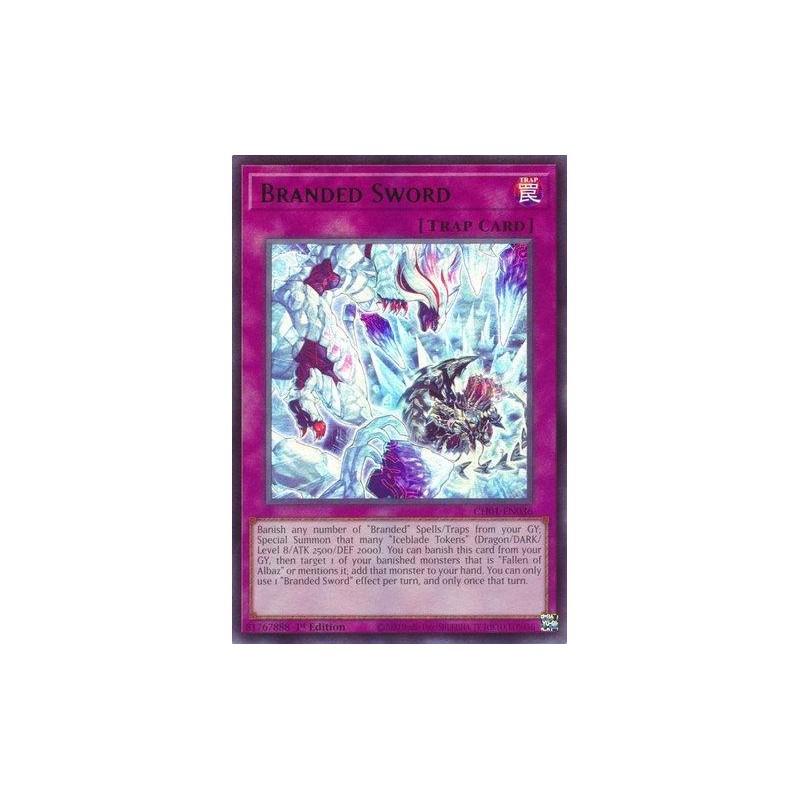 Texto (EN): Banish any number of "Branded" Spells/Traps from your GY; Special Summon that many "Iceblade Tokens" (Dragon/DARK/Level 8/ATK 2500/DEF 2000). You can banish this card from your GY, then target 1 of your banished monsters that is "Fallen of Albaz" or mentions it; add that monster to your hand. You can only use 1 "Branded Sword" effect per turn, and only once that turn.