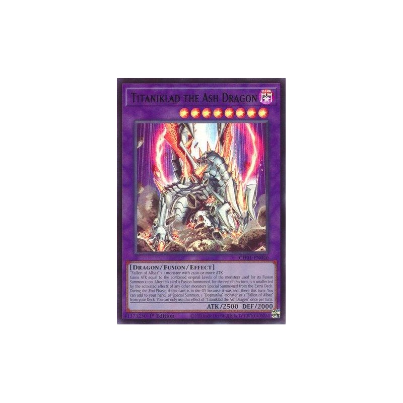Texto (EN): "Fallen of Albaz" + 1 monster with 2500 or more ATK Gains ATK equal to the combined original Levels of the monsters used for its Fusion Summon x 100. After this card is Fusion Summoned, for the rest of this turn, it is unaffected by the activated effects of any other monsters Special Summoned from the Extra Deck. During the End Phase, if this card is in the GY because it was sent there this turn: You can add to your hand, or Special Summon, 1 "Dogmatika" monster or 1 "Fallen of Albaz" from your Deck. You can only use this effect of "Titaniklad the Ash Dragon" once per turn.
