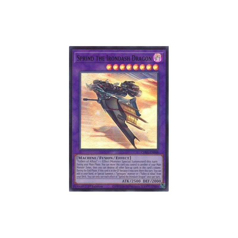 Texto (EN): "Fallen of Albaz" + 1 Effect Monster Special Summoned this turn During your Main Phase: You can move this card you control to another of your Main Monster Zones, then you can destroy all other face-up cards in this card's column. During the End Phase, if this card is in the GY because it was sent there this turn: You can add to your hand, or Special Summon, 1 "Springans" monster or 1 "Fallen of Albaz" from your Deck. You can only use each effect of "Sprind the Irondash Dragon" once per turn.