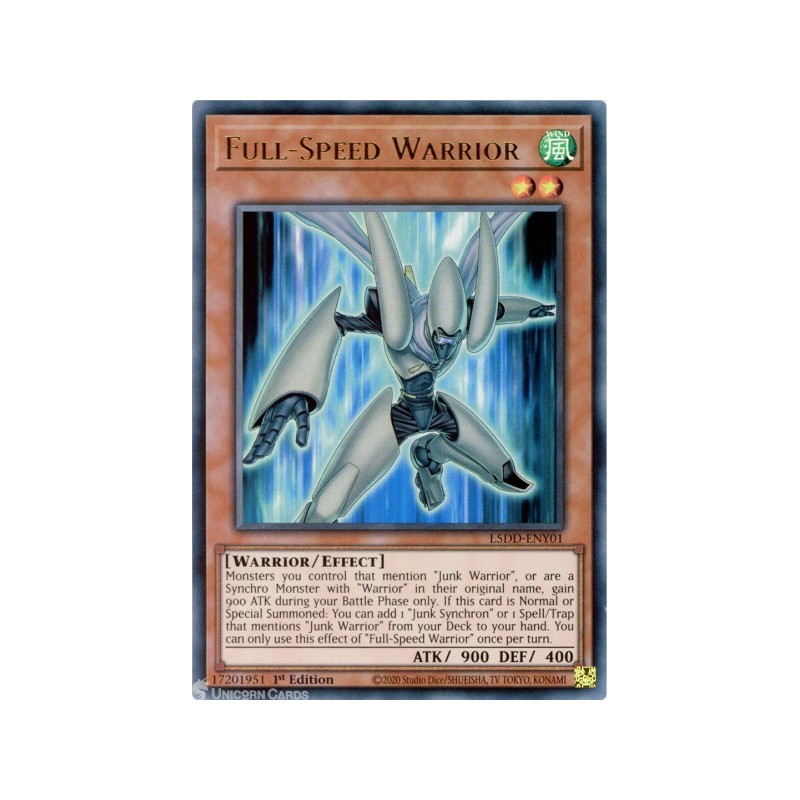 Texto (EN): If this card is Normal or Special Summoned: You can add 1 "Junk Synchron" or 1 Spell/Trap that mentions "Junk Warrior" from your Deck to your hand. You can only use this effect of "Fullspeed Warrior" once per turn. Monsters that mention "Junk Warrior", and Synchro Monsters with "Warrior" in their original name, you control gain 900 ATK during your Battle Phase only.