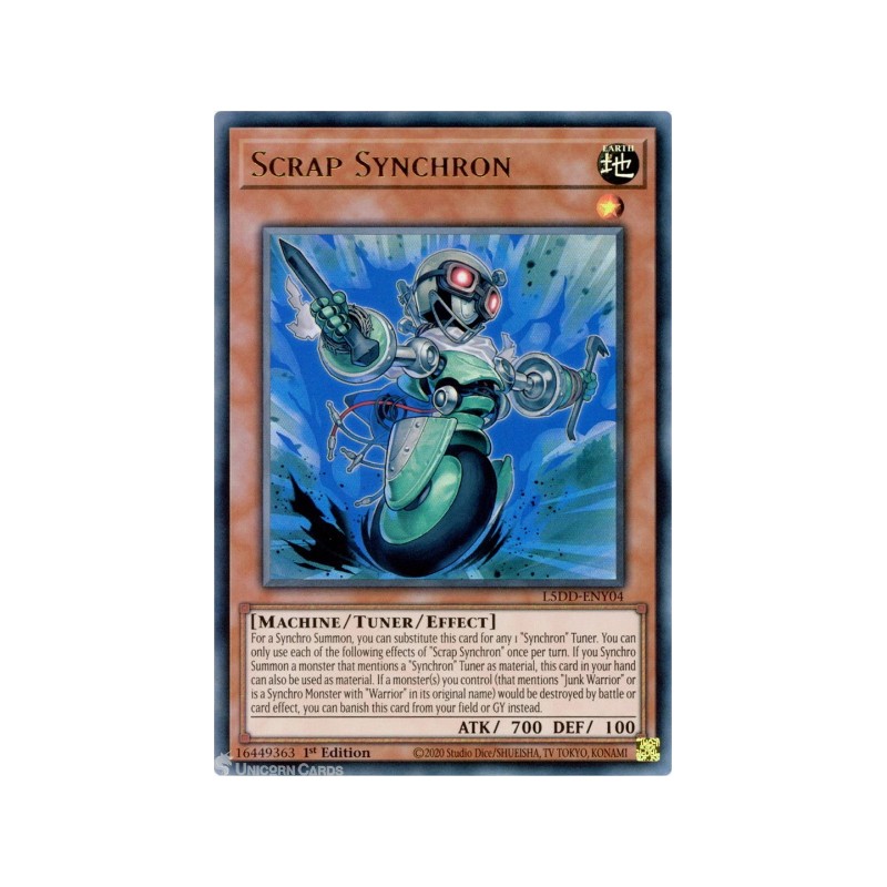Texto (EN): For a Synchro Summon, you can substitute this card for any 1 "Synchron" Tuner. If you Synchro Summon a monster that mentions a "Synchron" Tuner as material, this card in your hand can also be used as material. If a monster(s) you control that mentions "Junk Warrior" and/or is a Synchro Monster with "Warrior" in its original name would be destroyed by battle or card effect, you can banish this card from your field or GY instead. You can only use each effect of "Scrap Synchron" once per turn.