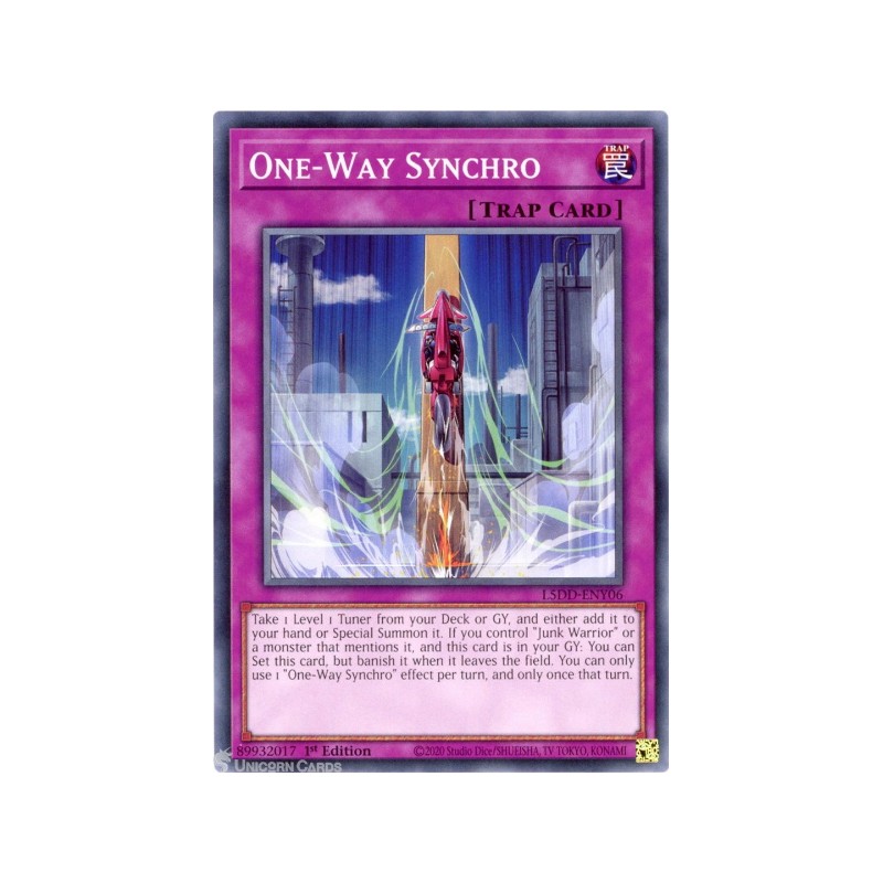 Texto (EN): Add to your hand, or Special Summon, 1 Level 1 Tuner from your Deck or GY. If this card is in your GY and you control "Junk Warrior" or a monster that mentions it: You can Set this card, but banish it when it leaves the field. You can only use 1 "One-Way Synchro" effect per turn, and only once that turn.