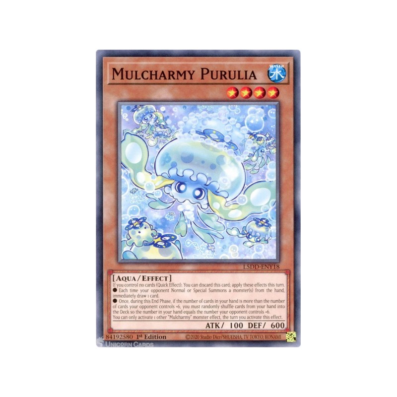 Texto (EN): If you control no cards (Quick Effect): You can discard this card; apply these effects this turn. ●Each time your opponent Normal or Special Summons a monster(s) from the hand, immediately draw 1 card. ●Once, during this End Phase, if the number of cards in your hand is more than the number of cards your opponent controls +6, you must randomly shuffle cards from your hand into the Deck so the number in your hand equals the number your opponent controls +6. You can only activate 1 other "Mulcharmy" monster effect, the turn you activate this effect.
