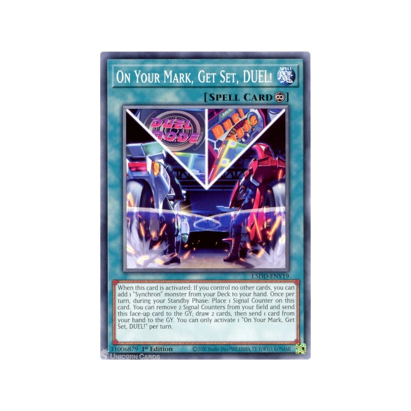 Texto (EN): When this card is activated: If you control no other cards, you can add 1 "Synchron" monster from your Deck to your hand. Once per turn, during your Standby Phase: Place 1 Signal Counter on this card. You can remove 2 Signal Counters from your field and send this face-up card to the GY; draw 2 cards, then send 1 card from your hand to the GY. You can only activate 1 "On Your Mark, Get Set, DUEL!" per turn.
