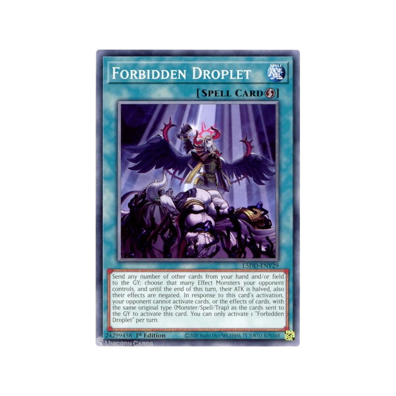 Texto (EN): Send any number of other cards from your hand and/or field to the GY; choose that many Effect Monsters your opponent controls, and until the end of this turn, their ATK is halved, also their effects are negated. In response to this card's activation, your opponent cannot activate cards, or the effects of cards, with the same original type (Monster/Spell/Trap) as the cards sent to the GY to activate this card. You can only activate 1 "Forbidden Droplet" per turn.