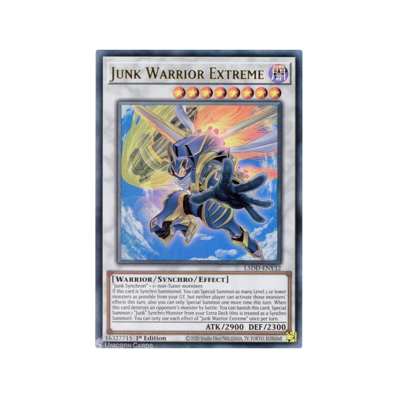 Texto (EN): "Junk Synchron" + 1+ non-Tuner monsters If this card is Synchro Summoned: You can Special Summon as many Level 2 or lower monsters from your GY as possible, and if you do, their effects cannot be activated for the rest of this turn, also you can only Special Summon once more for the rest of this turn. When this card destroys an opponent's monster by battle: You can banish this card; Special Summon 1 "Junk" Synchro Monster from your Extra Deck (this is treated as a Synchro Summon). You can only use each effect of "Junk Warrior Extreme" once per turn.