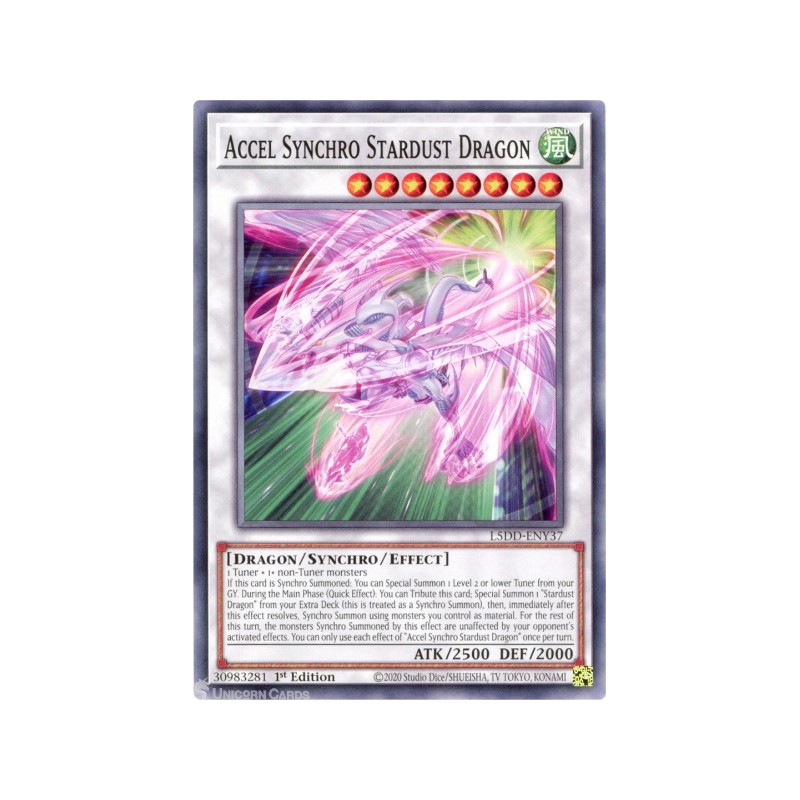 Texto (EN): 1 Tuner + 1+ non-Tuner monsters If this card is Synchro Summoned: You can Special Summon 1 Level 2 or lower Tuner from your GY. During the Main Phase (Quick Effect): You can Tribute this card; Special Summon 1 "Stardust Dragon" from your Extra Deck (this is treated as a Synchro Summon), then, immediately after this effect resolves, Synchro Summon using monsters you control as material. For the rest of this turn, the monsters Synchro Summoned by this effect are unaffected by your opponent's activated effects. You can only use each effect of "Accel Synchro Stardust Dragon" once per turn.