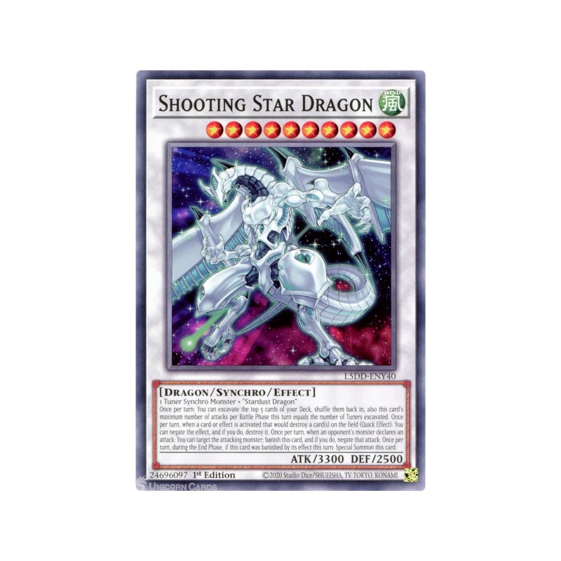 Texto (EN): 1 Tuner Synchro Monster + "Stardust Dragon" Once per turn: You can excavate the top 5 cards of your Deck, shuffle them back in, also this card's maximum number of attacks per Battle Phase this turn equals the number of Tuner monsters excavated. Once per turn, during either player's turn, when a card or effect is activated that would destroy a card(s) on the field: You can negate the effect, and if you do, destroy it. Once per turn, when an opponent's monster declares an attack: You can target the attacking monster; banish this card, and if you do, negate that attack. During the next End Phase: Special Summon this card banished by this effect.