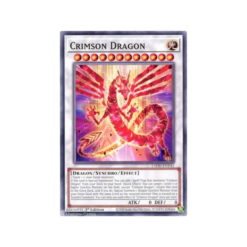 Texto (EN): 1 Tuner + 1+ non-Tuner monsters If this card is Special Summoned: You can add 1 Spell/Trap that mentions "Crimson Dragon" from your Deck to your hand. (Quick Effect): You can target 1 Level 7 or higher Synchro Monster on the field, except "Crimson Dragon"; return this card to the Extra Deck, and if you do, Special Summon 1 Dragon Synchro Monster from your Extra Deck with the same Level as the targeted monster. (This is treated as a Synchro Summon.) You can only use each effect of "Crimson Dragon" once per turn.