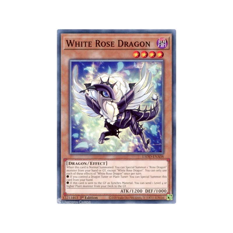 Texto (EN): When this card is Normal Summoned: You can Special Summon 1 "Rose Dragon" monster from your hand or GY, except "White Rose Dragon". You can only use each of these effects of "White Rose Dragon" once per turn. ●If you control a Dragon Tuner or Plant Tuner: You can Special Summon this card from your hand. ●If this card is sent to the GY as Synchro Material: You can send 1 Level 4 or higher Plant monster from your Deck to the GY.
