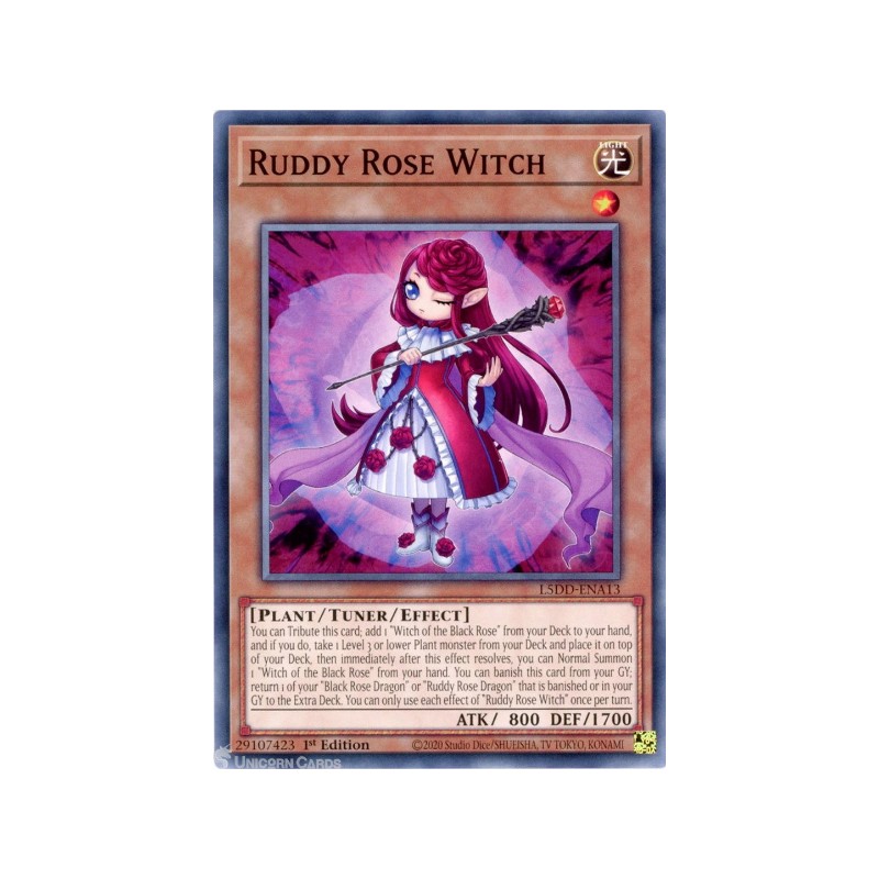 Texto (EN): You can Tribute this card; add 1 "Witch of the Black Rose" from your Deck to your hand, and if you do, take 1 Level 3 or lower Plant monster from your Deck and place it on top of your Deck, then immediately after this effect resolves, you can Normal Summon 1 "Witch of the Black Rose" from your hand. You can banish this card from your GY; return 1 of your "Black Rose Dragon" or "Ruddy Rose Dragon" that is banished or in your GY to the Extra Deck. You can only use each effect of "Ruddy Rose Witch" once per turn.