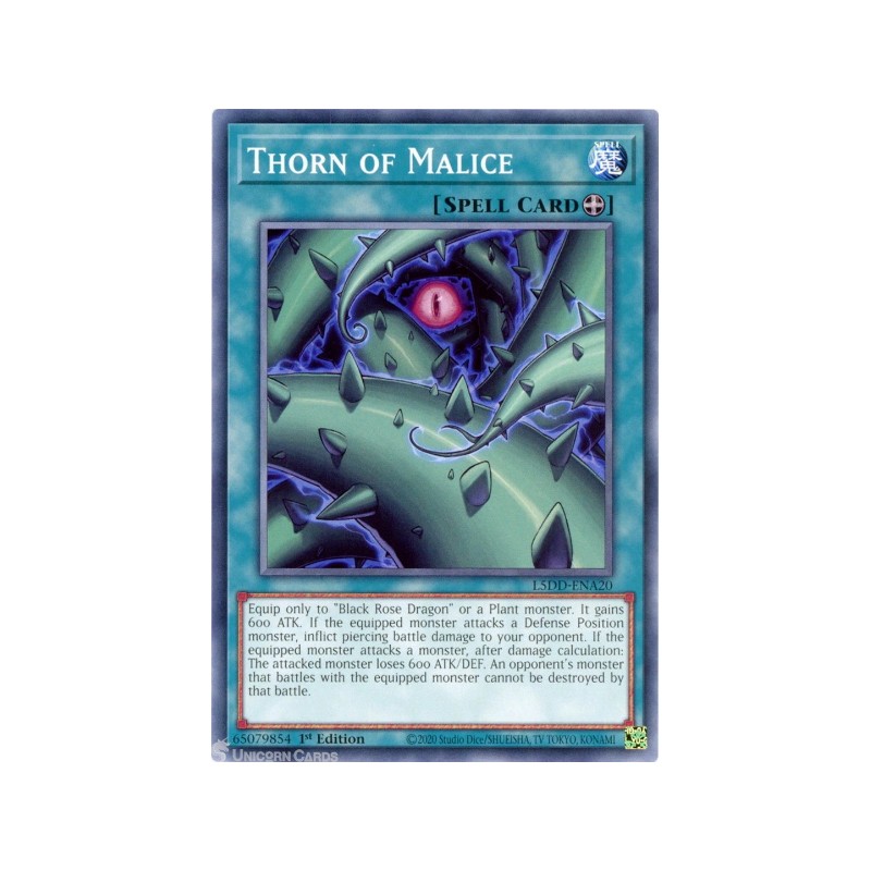Texto (EN): Equip only to "Black Rose Dragon" or a Plant-Type monster. It gains 600 ATK. If the equipped monster attacks a Defense Position monster, inflict piercing battle damage to your opponent. If the equipped monster attacks a monster, after damage calculation: The attacked monster loses 600 ATK and DEF. An opponent's monster that battles with the equipped monster cannot be destroyed by that battle.