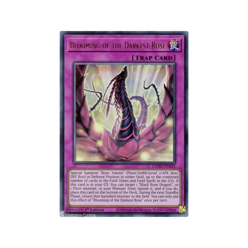 Texto (EN): Special Summon "Rose Tokens" (Plant/DARK/Level 2/ATK 800/DEF 800) in Defense Position to either field, up to the combined number of cards in the Field Zones and Field Spells in the GYs. If this card is in your GY: You can target 1 "Black Rose Dragon", or 1 Plant monster, in your Monster Zone; banish it, and if you do, place this card on the bottom of the Deck. During the next Standby Phase, return that banished monster to the field. You can only use this effect of "Blooming of the Darkest Rose" once per turn.