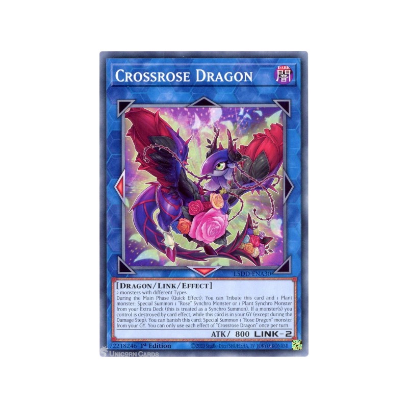 Texto (EN): 2 monsters with different Types During the Main Phase (Quick Effect): You can Tribute this card and 1 Plant monster; Special Summon 1 "Rose" Synchro Monster or 1 Plant Synchro Monster from your Extra Deck. (This is treated as a Synchro Summon.) If a monster(s) you control is destroyed by card effect, while this card is in your GY (except during the Damage Step): You can banish this card; Special Summon 1 "Rose Dragon" monster from your GY. You can only use each effect of "Crossrose Dragon" once per turn.