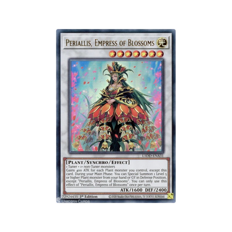 Texto (EN): 1 Tuner + 1+ non-Tuner monsters Gains 400 ATK for each Plant monster you control, except this card. During your Main Phase: You can Special Summon 1 Level 5 or higher Plant monster from your hand or GY in Defense Position, except "Periallis, Empress of Blossoms". You can only use this effect of "Periallis, Empress of Blossoms" once per turn.
