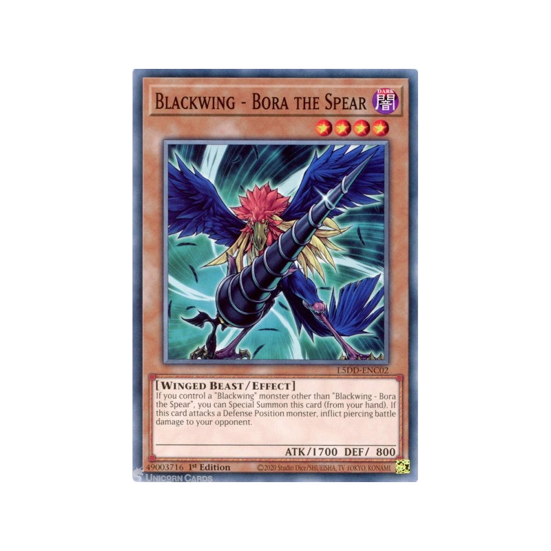 Texto (EN): If you control a "Blackwing" monster other than "Blackwing - Bora the Spear", you can Special Summon this card (from your hand). If this card attacks a Defense Position monster, inflict piercing battle damage.