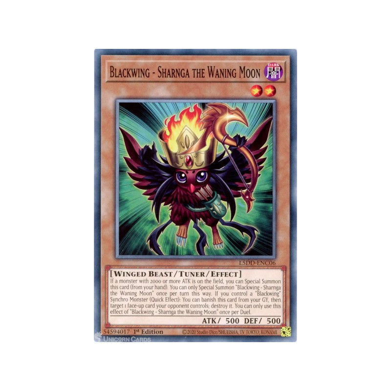 Texto (EN): If a monster with 2000 or more ATK is on the field, you can Special Summon this card (from your hand). You can only Special Summon "Blackwing - Sharnga the Waning Moon" once per turn this way. If you control a "Blackwing" Synchro Monster (Quick Effect): You can banish this card from your GY, then target 1 face-up card your opponent controls; destroy it. You can only use this effect of "Blackwing - Sharnga the Waning Moon" once per Duel.