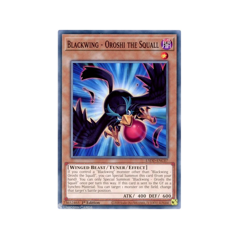 Texto (EN): If you control a "Blackwing" monster other than "Blackwing - Oroshi the Squall", you can Special Summon this card (from your hand). You can only Special Summon "Blackwing - Oroshi the Squall" once per turn this way. If this card is sent to the GY as a Synchro Material: You can target 1 monster on the field; change that target's battle position.