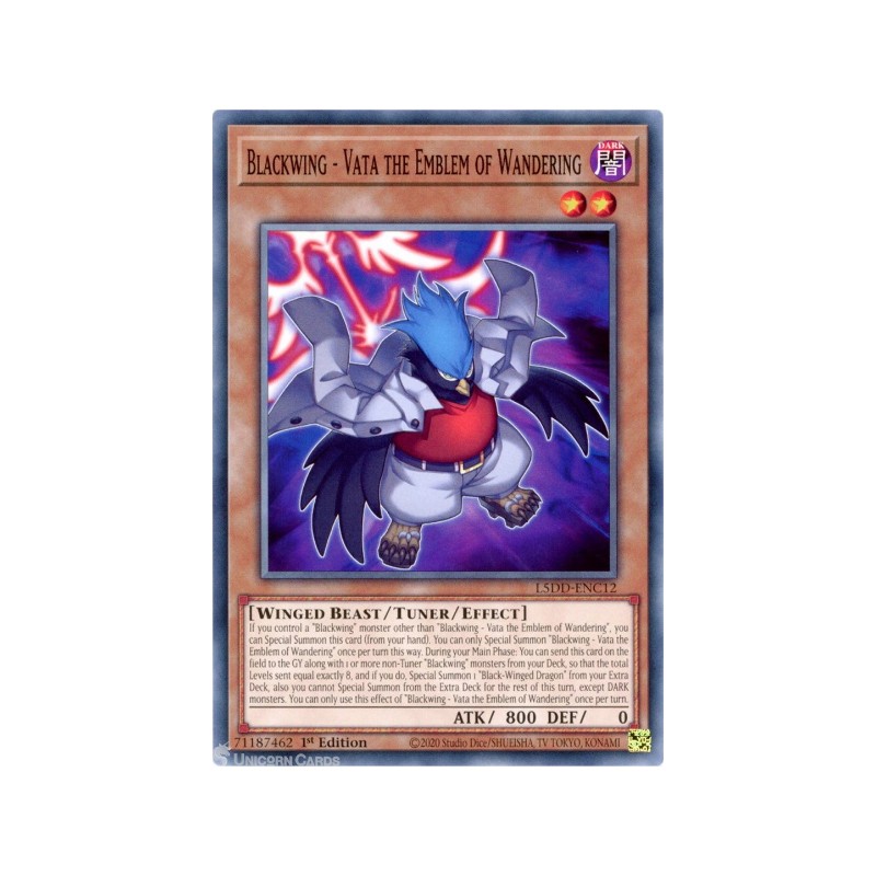 Texto (EN): If you control a "Blackwing" monster other than "Blackwing - Vata the Emblem of Wandering", you can Special Summon this card (from your hand). You can only Special Summon "Blackwing - Vata the Emblem of Wandering" once per turn this way. During your Main Phase: You can send this card on the field to the GY along with 1 or more non-Tuner "Blackwing" monsters from your Deck, so that the total Levels sent equal exactly 8, and if you do, Special Summon 1 "Black-Winged Dragon" from your Extra Deck, also you cannot Special Summon monsters from the Extra Deck for the rest of this turn, except DARK monsters. You can only use this effect of "Blackwing - Vata the Emblem of Wandering" once per turn.