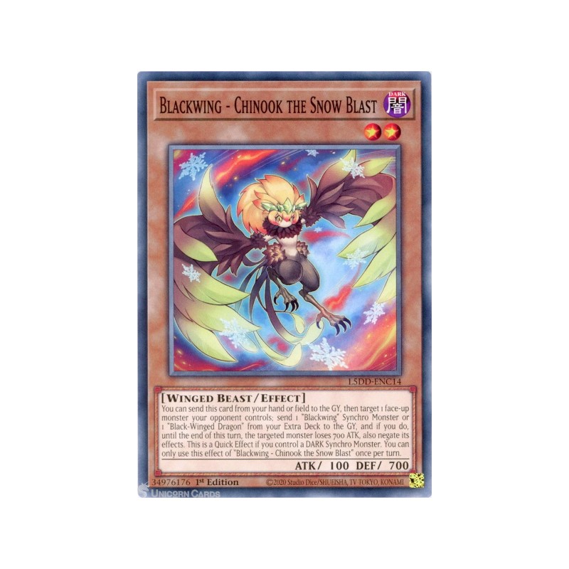 Texto (EN): You can send this card from your hand or field to the GY, then target 1 face-up monster your opponent controls; send 1 "Blackwing" Synchro Monster or 1 "Black-Winged Dragon" from your Extra Deck to the GY, and if you do, until the end of this turn, the targeted monster loses 700 ATK, also negate its effects. This is a Quick Effect if you control a DARK Synchro Monster. You can only use this effect of "Blackwing - Chinook the Snow Blast" once per turn.