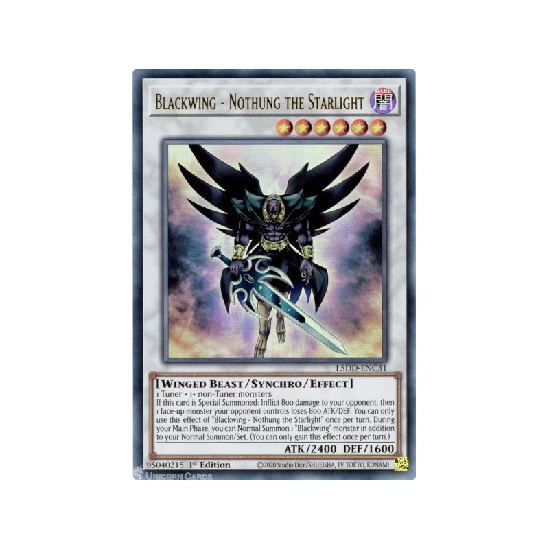 Texto (EN): 1 Tuner + 1 or more non-Tuner monsters If this card is Special Summoned: Inflict 800 damage to your opponent, then 1 face-up monster your opponent controls loses 800 ATK and DEF. You can only use this effect of "Blackwing - Nothung the Starlight" once per turn. During your Main Phase, you can Normal Summon 1 "Blackwing" monster in addition to your Normal Summon/Set. (You can only gain this effect once per turn.)