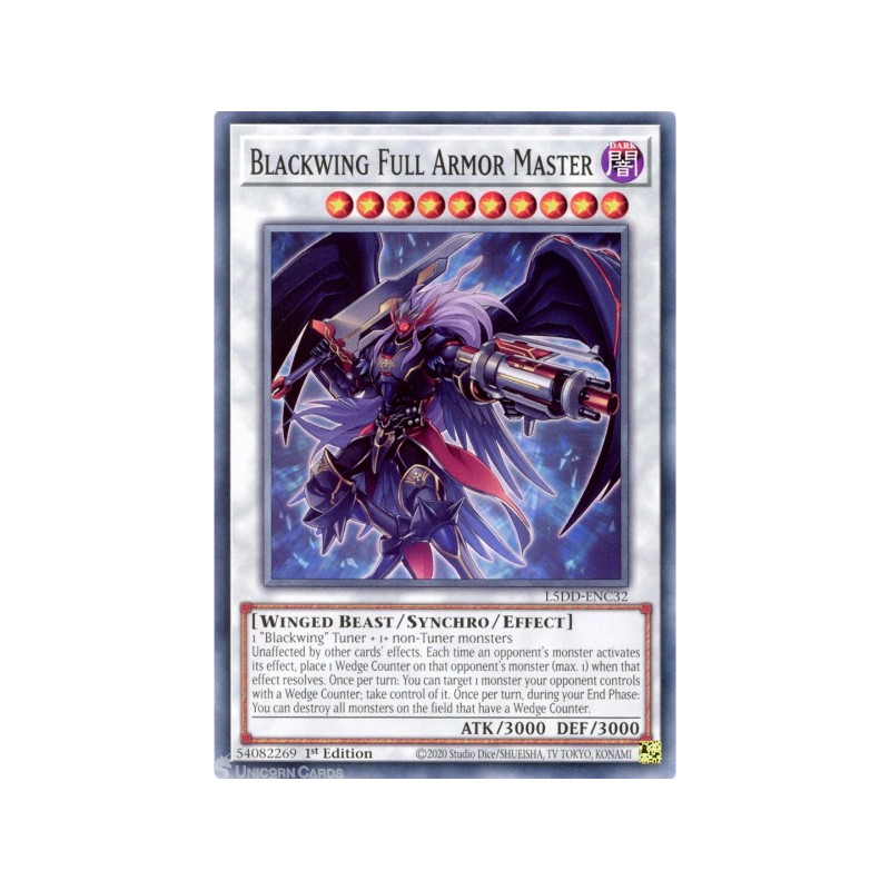 Texto (EN): 1 "Blackwing" Tuner + 1+ non-Tuner monsters Unaffected by other cards' effects. Each time an opponent's monster activates its effect, place 1 Wedge Counter on that opponent's monster (max. 1) after that effect resolves. Once per turn: You can target 1 monster your opponent controls with a Wedge Counter; take control of it. Once per turn, during your End Phase: You can destroy all monsters on the field that have a Wedge Counter.