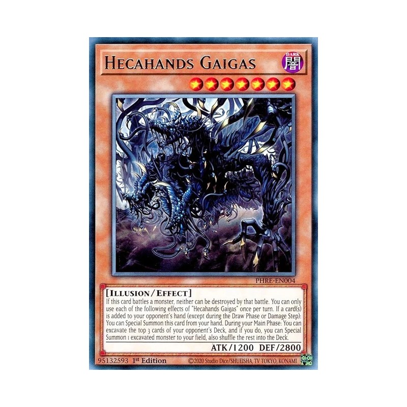 Texto (EN): If this card battles a monster, neither can be destroyed by that battle. You can only use each of the following effects of "Hecahands Gaigas" once per turn. If a card(s) is added to your opponent's hand (except during the Draw Phase or Damage Step): You can Special Summon this card from your hand. During your Main Phase: You can excavate the top 3 cards of your opponent's Deck, and if you do, you can Special Summon 1 excavated monster to your field, also shuffle the rest into the Deck.