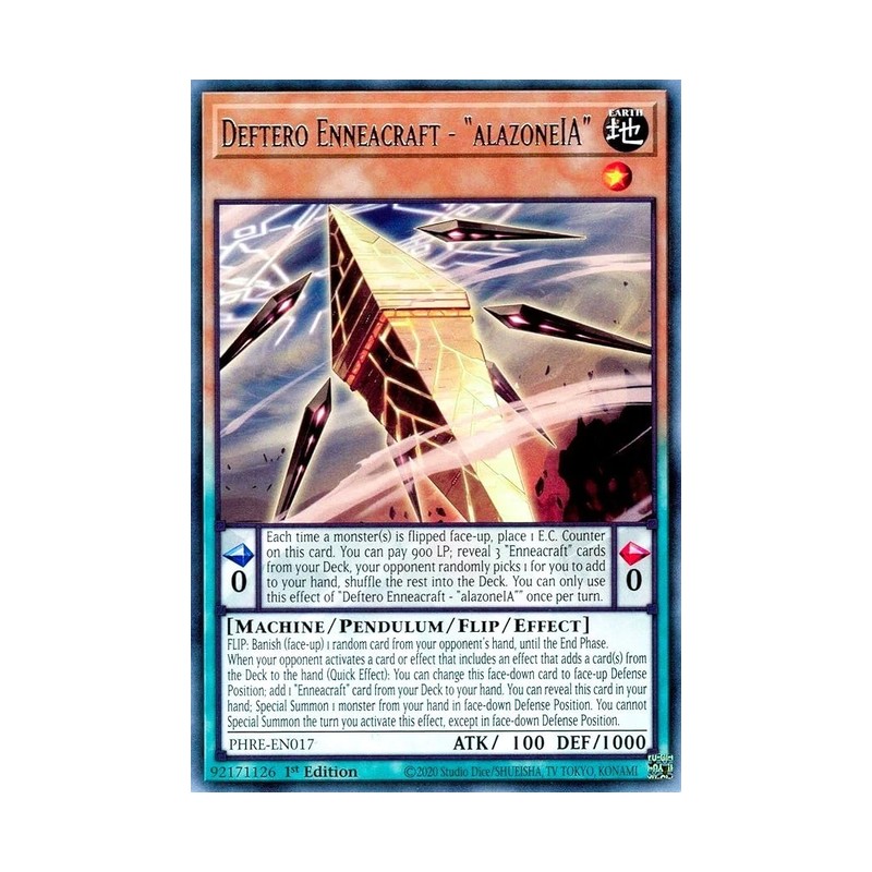 Texto (EN): Pendulum Effect Each time a monster(s) is flipped face-up, place 1 E.C. Counter on this card. You can pay 900 LP; reveal 3 "Enneacraft" cards from your Deck, your opponent randomly picks 1 for you to add to your hand, shuffle the rest into the Deck. You can only use this effect of "Deftero Enneacraft - "alazoneIA"" once per turn. Monster Effect FLIP: Banish (face-up) 1 random card from your opponent's hand, until the End Phase. When your opponent activates a card or effect that includes an effect that adds a card(s) from the Deck to the hand (Quick Effect): You can change this face-down card to face-up Defense Position; add 1 "Enneacraft" card from your Deck to your hand. You can reveal this card in your hand; Special Summon 1 monster from your hand in face-down Defense Position. You cannot Special Summon the turn you activate this effect, except in face-down Defense Position.