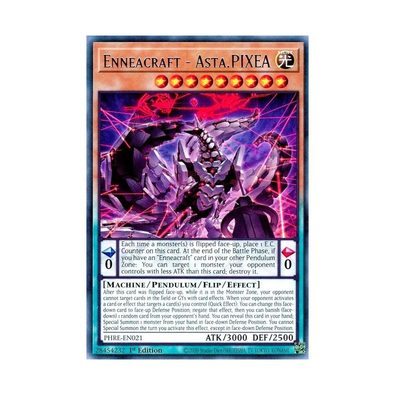 Texto (EN): Pendulum Effect Each time a monster(s) is flipped face-up, place 1 E.C. Counter on this card. At the end of the Battle Phase, if you have an "Enneacraft" card in your other Pendulum Zone: You can target 1 monster your opponent controls with less ATK than this card; destroy it. Monster Effect After this card was flipped face-up, while it is in the Monster Zone, your opponent cannot target cards in the field or GYs with card effects. When your opponent activates a card or effect that targets a card(s) you control (Quick Effect): You can change this face-down card to face-up Defense Position; negate that effect, then you can banish (face-down) 1 random card from your opponent's hand. You can reveal this card in your hand; Special Summon 1 monster from your hand in face-down Defense Position. You cannot Special Summon the turn you activate this effect, except in face-down Defense Position.