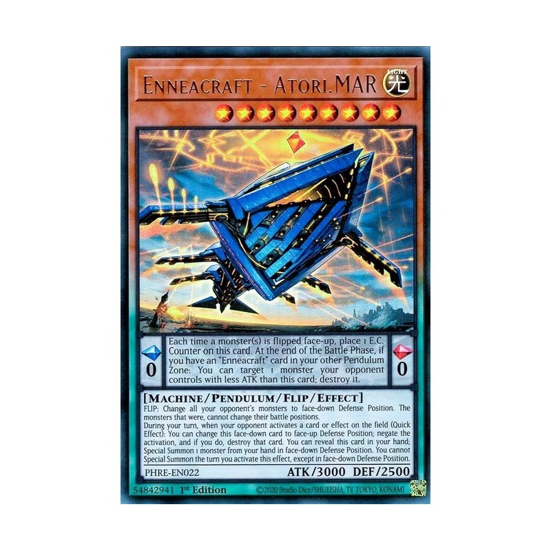Texto (EN): Pendulum Effect Each time a monster(s) is flipped face-up, place 1 E.C. Counter on this card. At the end of the Battle Phase, if you have an "Enneacraft" card in your other Pendulum Zone: You can target 1 monster your opponent controls with less ATK than this card; destroy it. Monster Effect FLIP: Change all your opponent's monsters to face-down Defense Position. The monsters that were, cannot change their battle positions. During your turn, when your opponent activates a card or effect on the field (Quick Effect): You can change this face-down card to face-up Defense Position; negate the activation, and if you do, destroy that card. You can reveal this card in your hand; Special Summon 1 monster from your hand in face-down Defense Position. You cannot Special Summon the turn you activate this effect, except in face-down Defense Position.